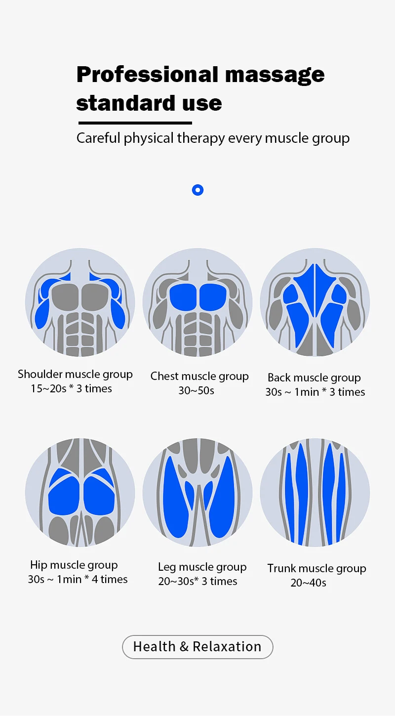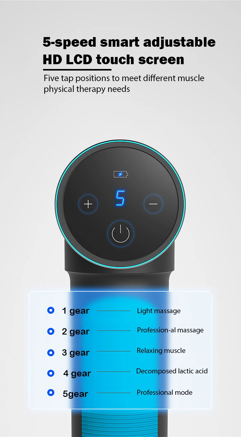 2.1 gear:Light massage/2 gear:Professional massage/3gear:Relaxingmuscle/4gear:Decomposed lactic acid/5gear:Professional mode